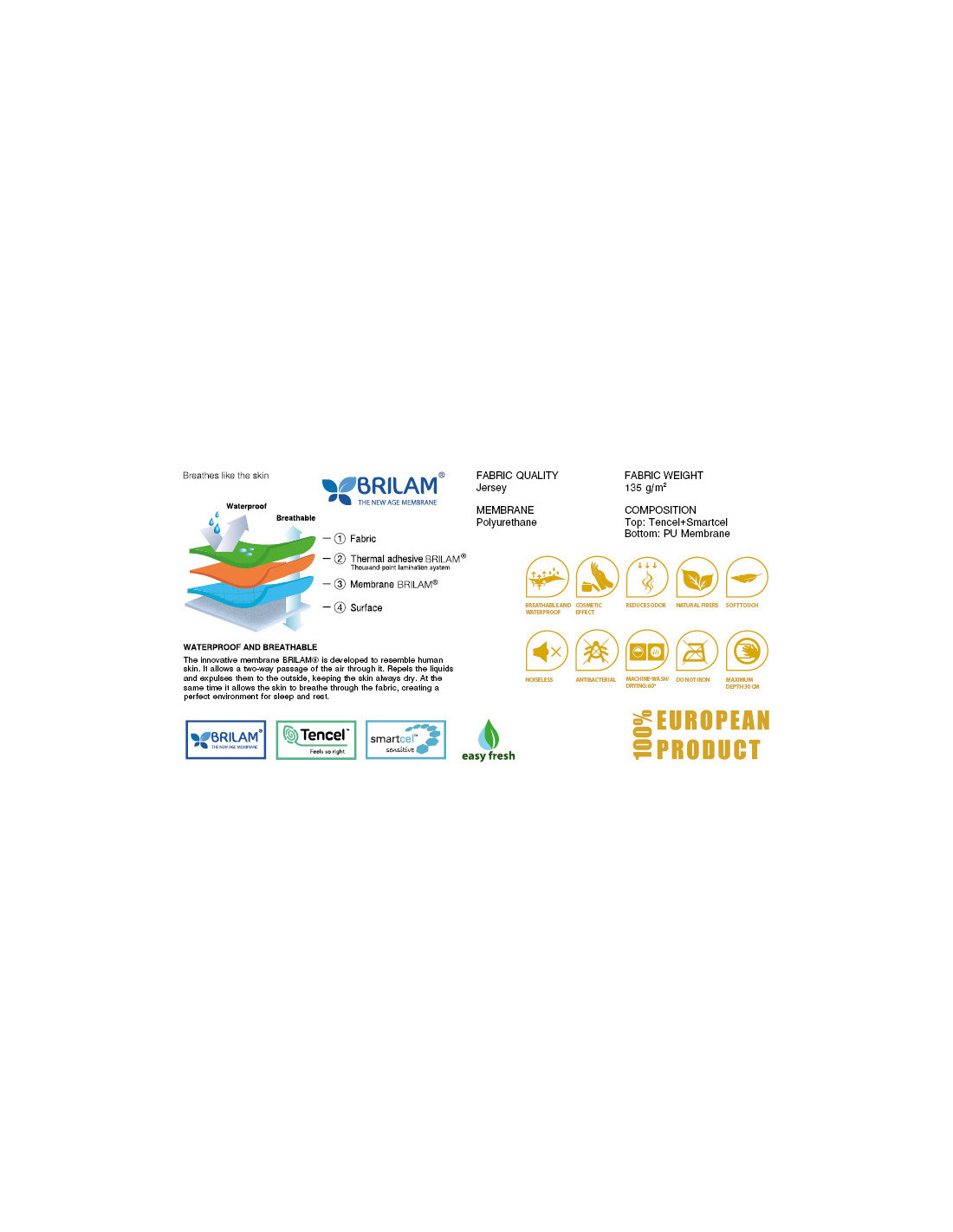 2 в 1 КАЛЪФ-ПРОТЕКТОР ЗА МАТРАК, непромокаем и двойнодишащ SMARTCEL GOLD осигурява максимално ниво на комфорт по времена сън благодарение на интелигентната мембрана BRILAM®. Въз основа на последно поколение на TENCEL™ влакна, плата е третиранс цинков оксид по специална технология позволяваща запазванетому след всяко пране. Цинкът е важен минерал с козметичен ефектвъзстановяващ и предпазващ кожата, намаляващ миризмите и ес антибактериално действие. Така третираният плат придобиваизумителна мекота и фино усещане при допир. Този калъф-протектор, е създаден на основата на нановлакна и е специално проектиран да абсорбира големи количества влага. Притежава специфично свойство за терморегулация, като по този начин намаляваизпотяването и неутрализира влагата. По този начин се създавапо-благоприятна топла и чиста среда за сън.