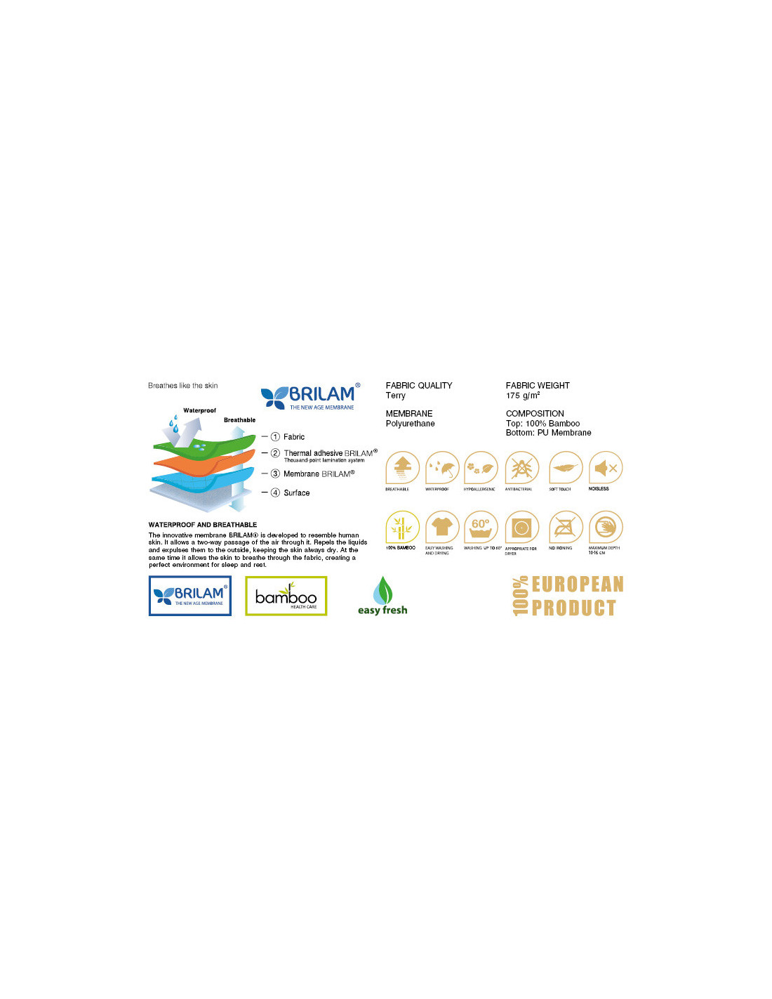 2 в 1 КАЛЪФ-ПРОТЕКТОР ЗА МАТРАК , непромокаем и двойнодишащ. TERRY BAMBOO е непромокаем, двойнодишащ калъф-протектор с преграда срещу акари, благодарение на интелигентната мембрана BRILAM®. Гарантира естествена антиалергична среда за сън на вашето бебе.Бамбуковите влакна съдържат естествен антиалергичен агент, който предпазва от развитието на бактерии. Това прави бамбуковата тъкан изключително подходяща за бебета склонни към алергии.Продуктите от бамбук имат способността да дишат, абсорбират влагата от кожата, като я запазват суха и създават по-благоприятна среда за сън. Благодарение на тези си качества действа и като естествен дезодорант.
