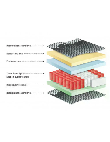 висококачествен текстил, 7 зонов Pocket System, Memory пяна, високоеластична пяна, еластична пяна